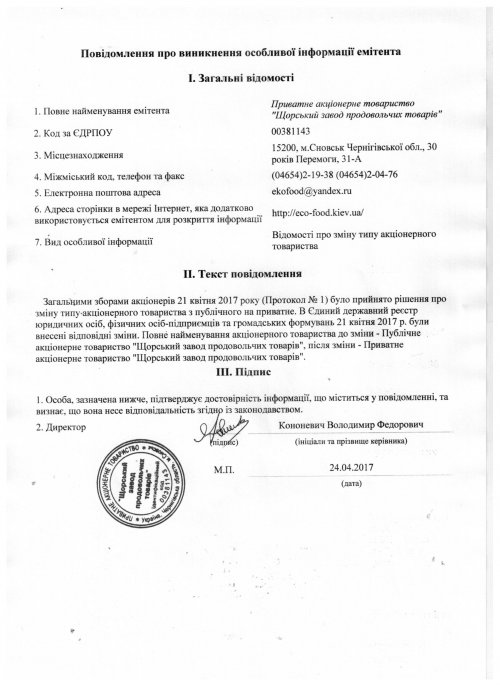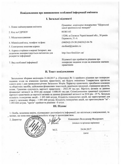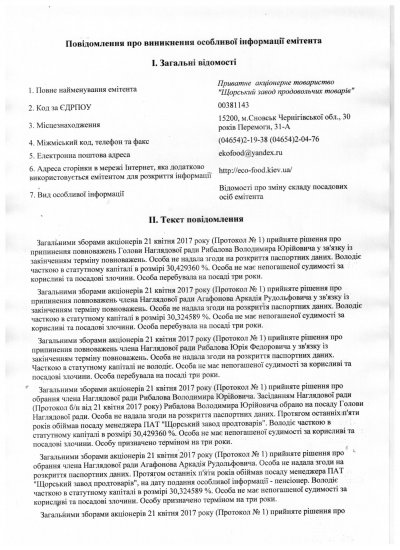ПОВІДОМЛЕННЯ ПРО ПІДСУМКИ ГОЛОСУВАННЯ НА РІЧНИХ ЗАГАЛЬНИХ ЗБОРАХ ПУБЛІЧНОГО АКЦІОНЕРНОГО ТОВАРИСТВА “ЩОРСЬКИЙ ЗАВОД ПРОДОВОЛЬЧИХ ТОВАРІВ”, які відбулись 21 квітня 2017 року