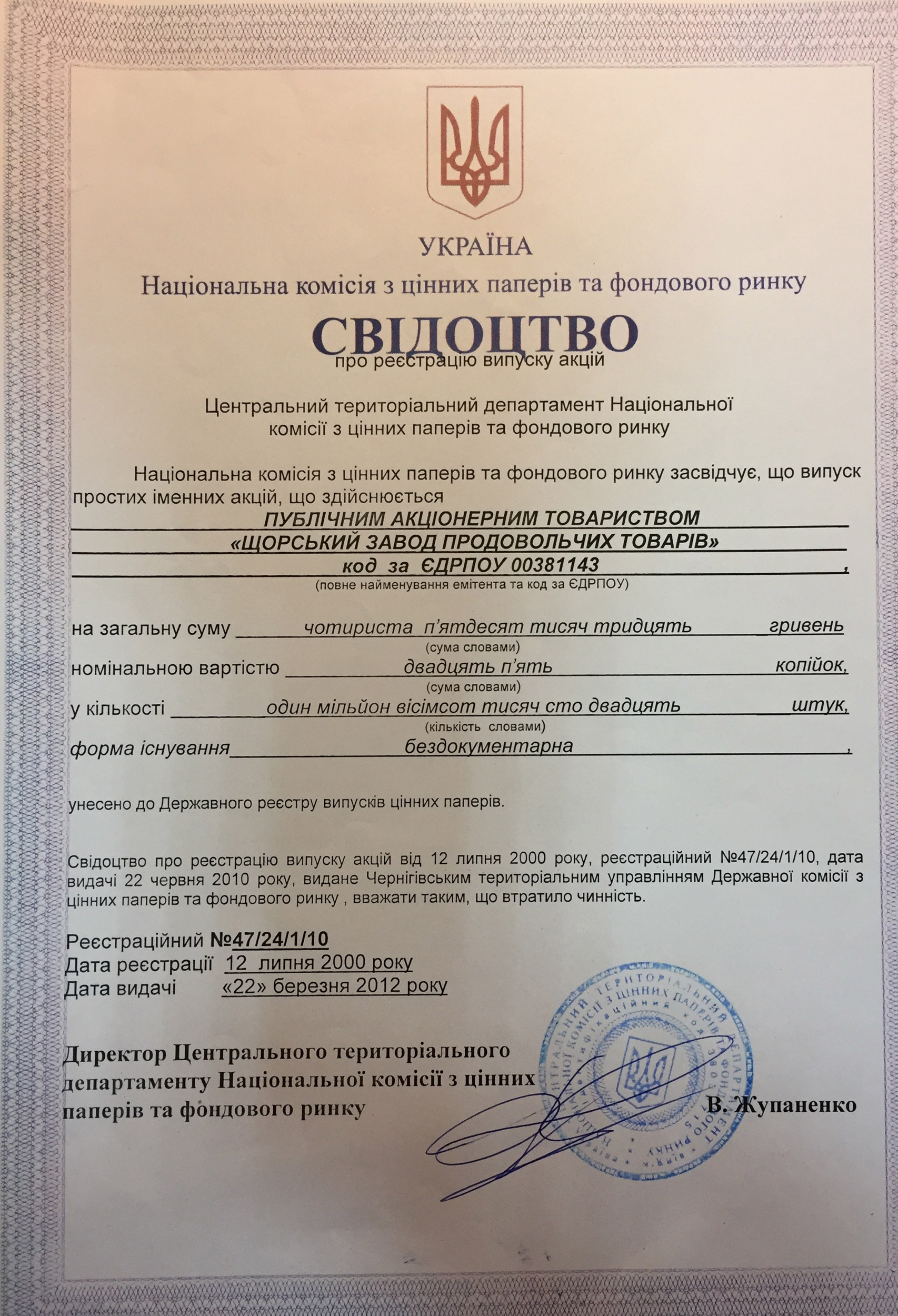 Свидетельство о регистрации выпуска акций