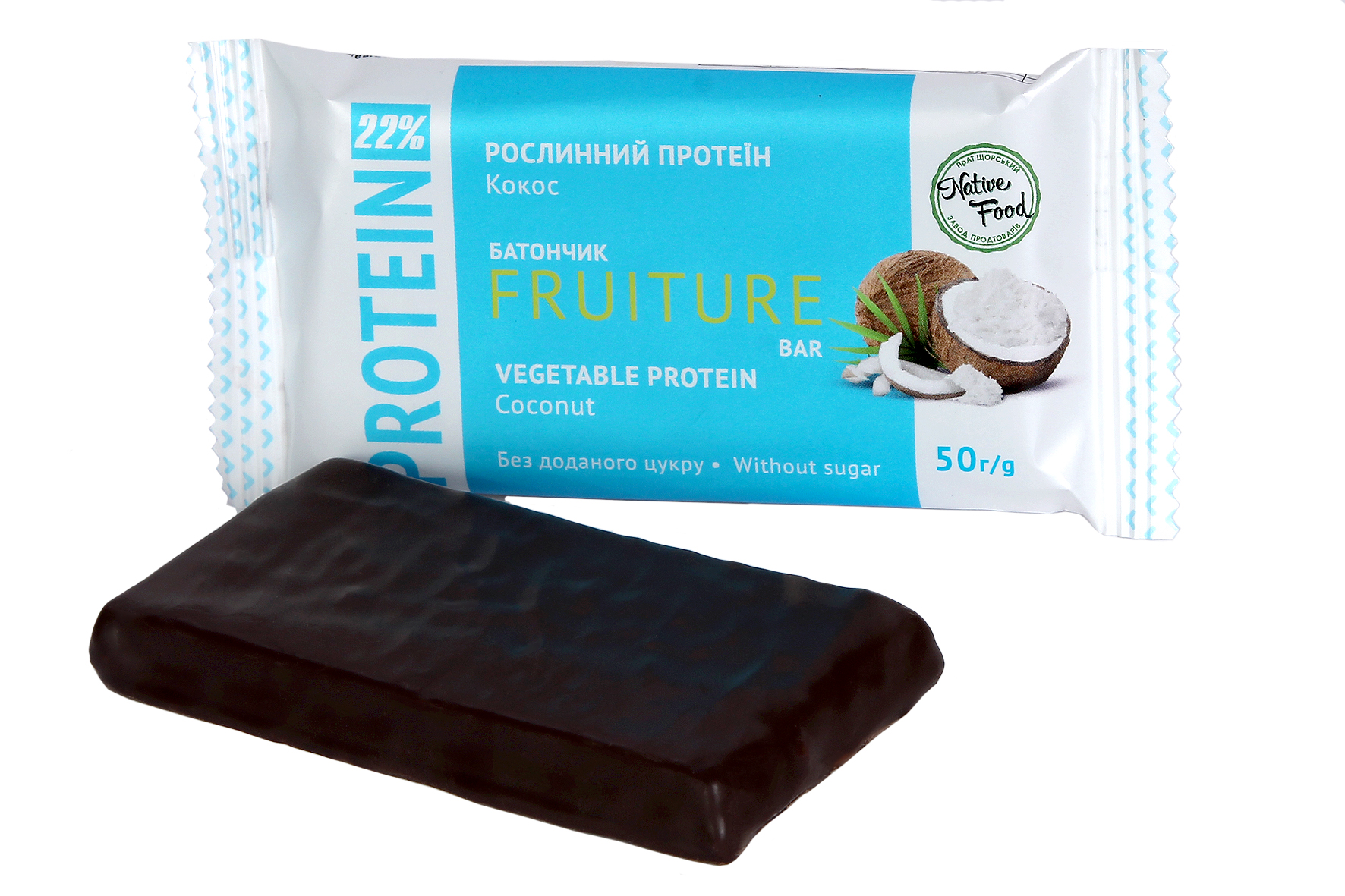 Протеїновий батончик, глазурований кондитерською глазур’ю без цукру, з корпусом з натурального меду, горохового протеїну та кокосової стружки.